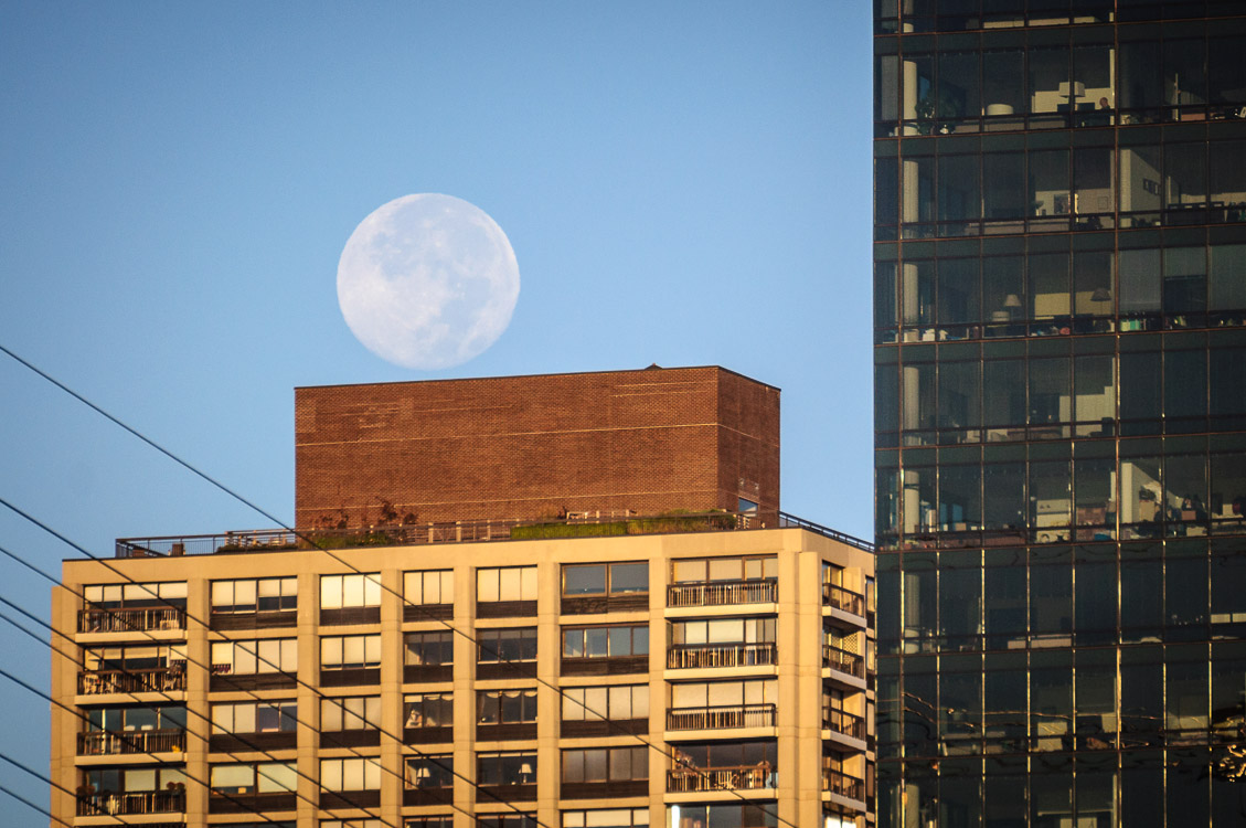 I usually get a MetroCard whenever I visit NYC and the Roosevelt Island tram is well worth the $30. If you can ride this near the sunrise or sunset, you can get some great light pouring over the skyline, the Ed Koch Queensboro Bridge, and the East River. I was lucky enough this particular morning to get the sun rising behind me and the moon setting in front of me. I got on the tram just in time to catch the moon before it disappeared behind the skyline.